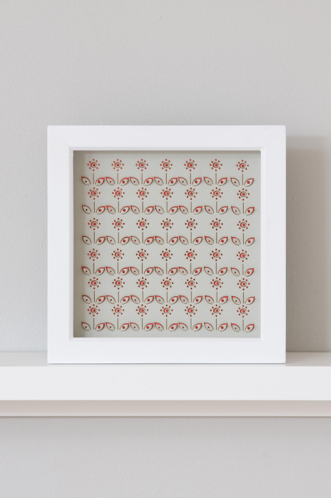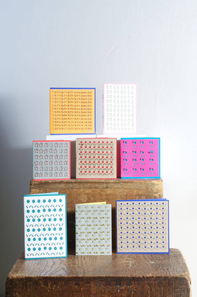 Navdeep uses a laser/cutter to produce intricate patterns. All pieces are handcrafted using recycled card, paper and perspex.