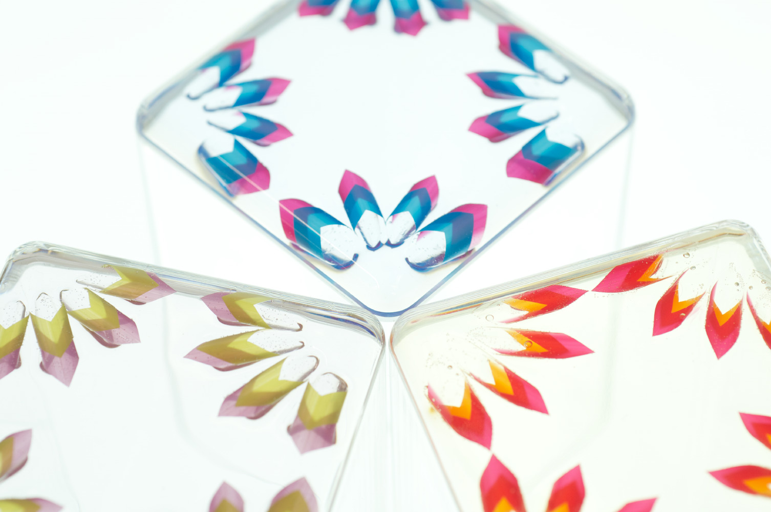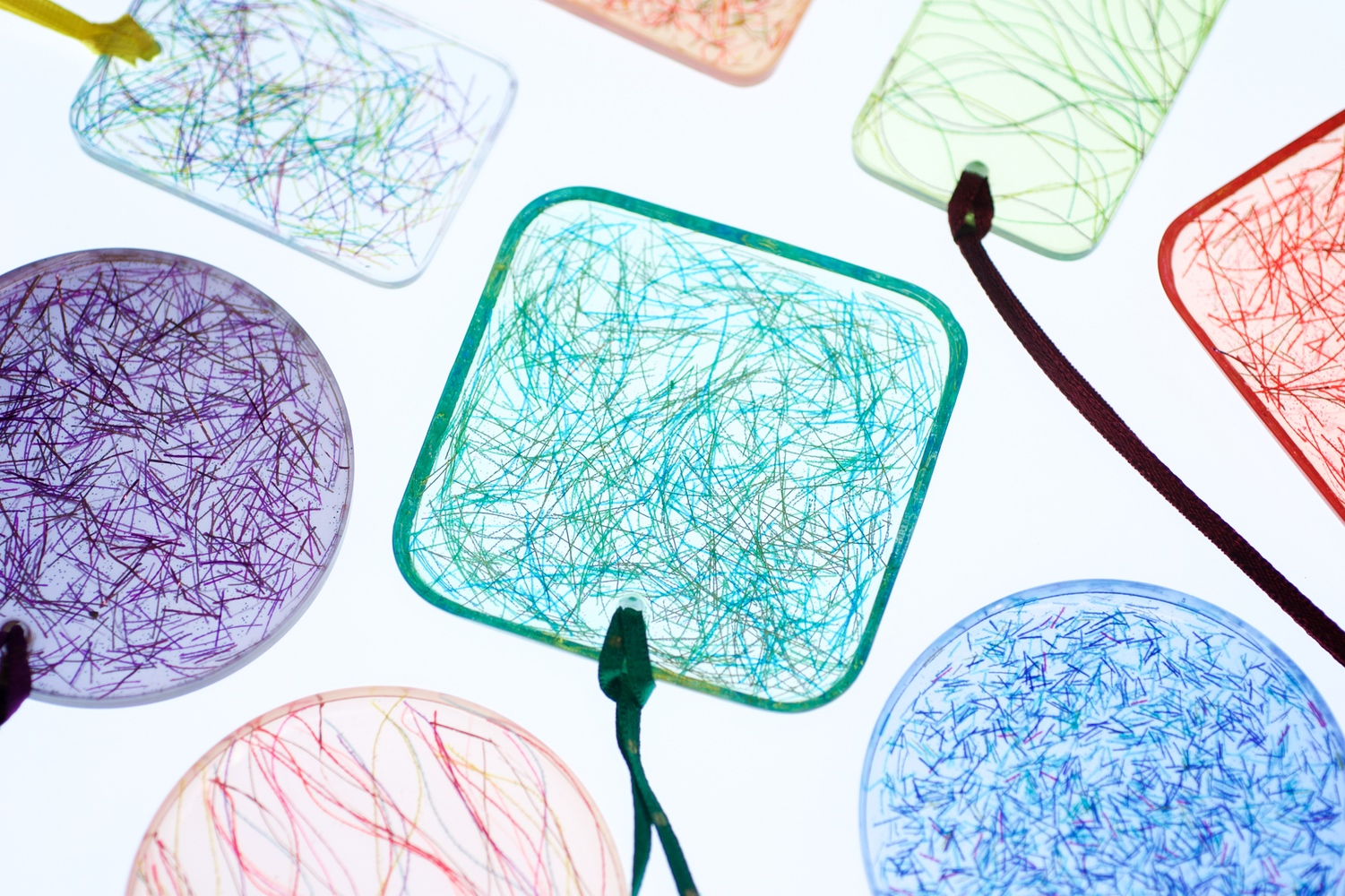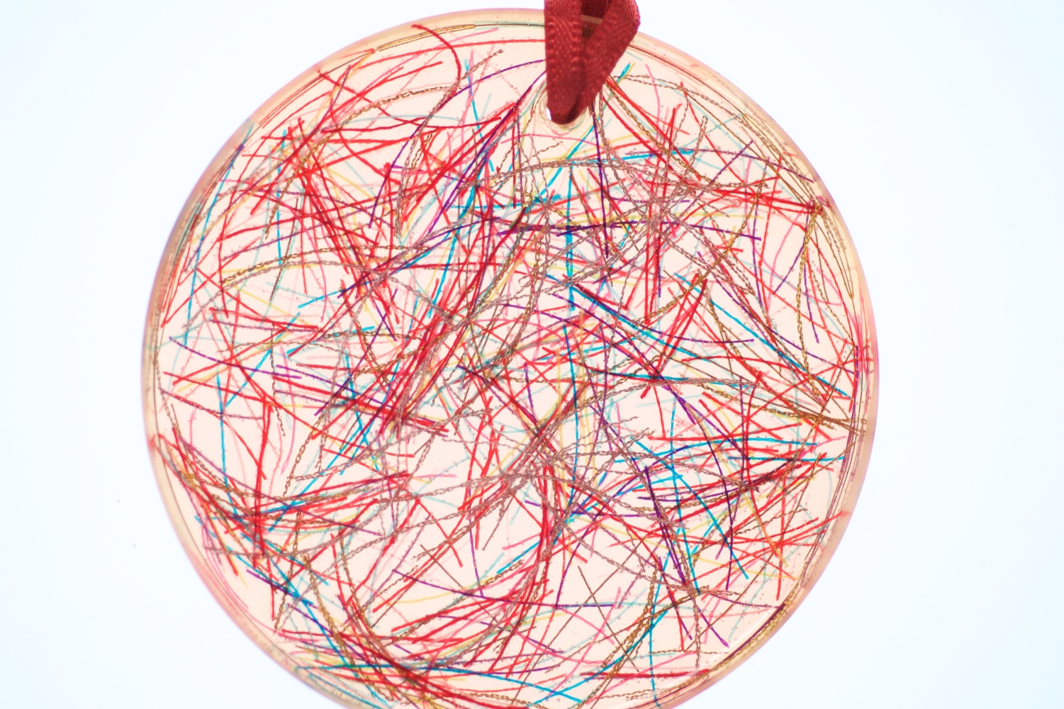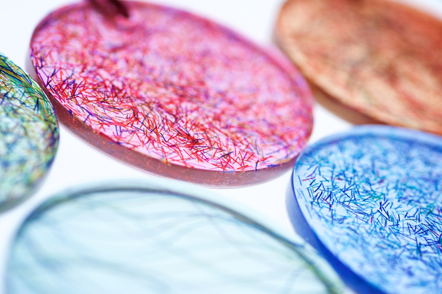 Navdeep uses resin as a base to embed patterns made from thread, hand-dyed plastic and beads.