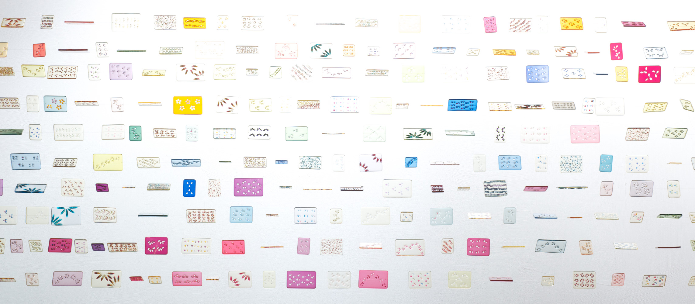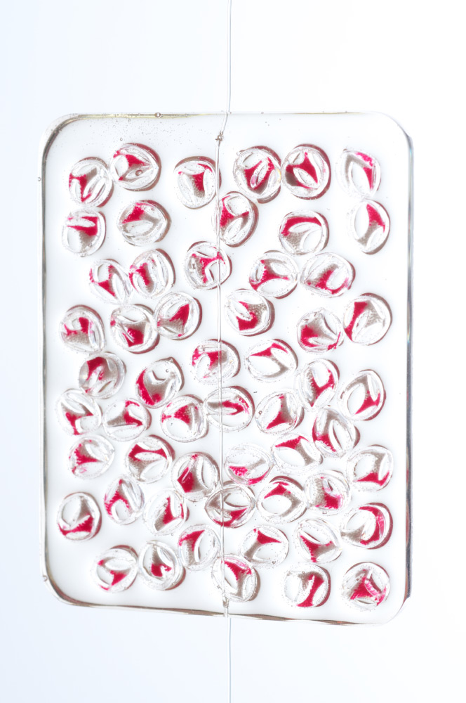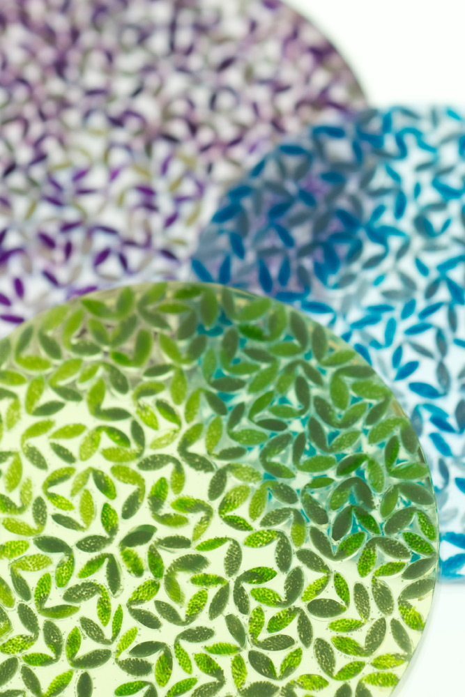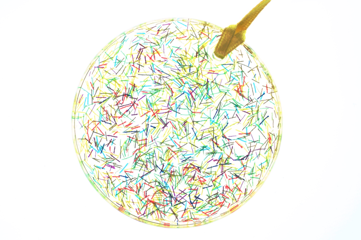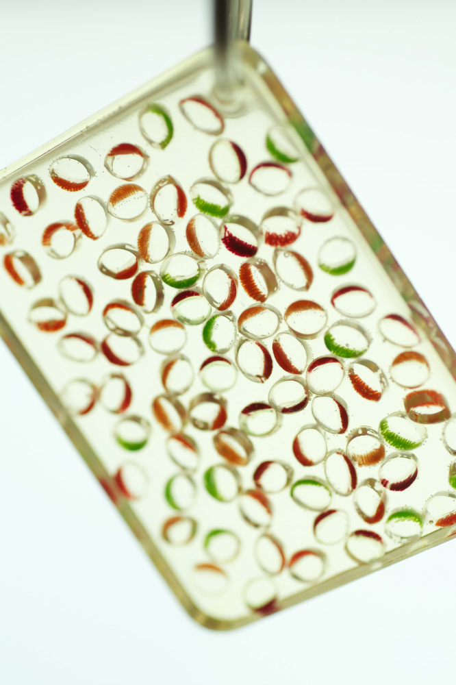 Navdeep uses resin as a base to embed patterns made from thread, hand-dyed plastic and beads.