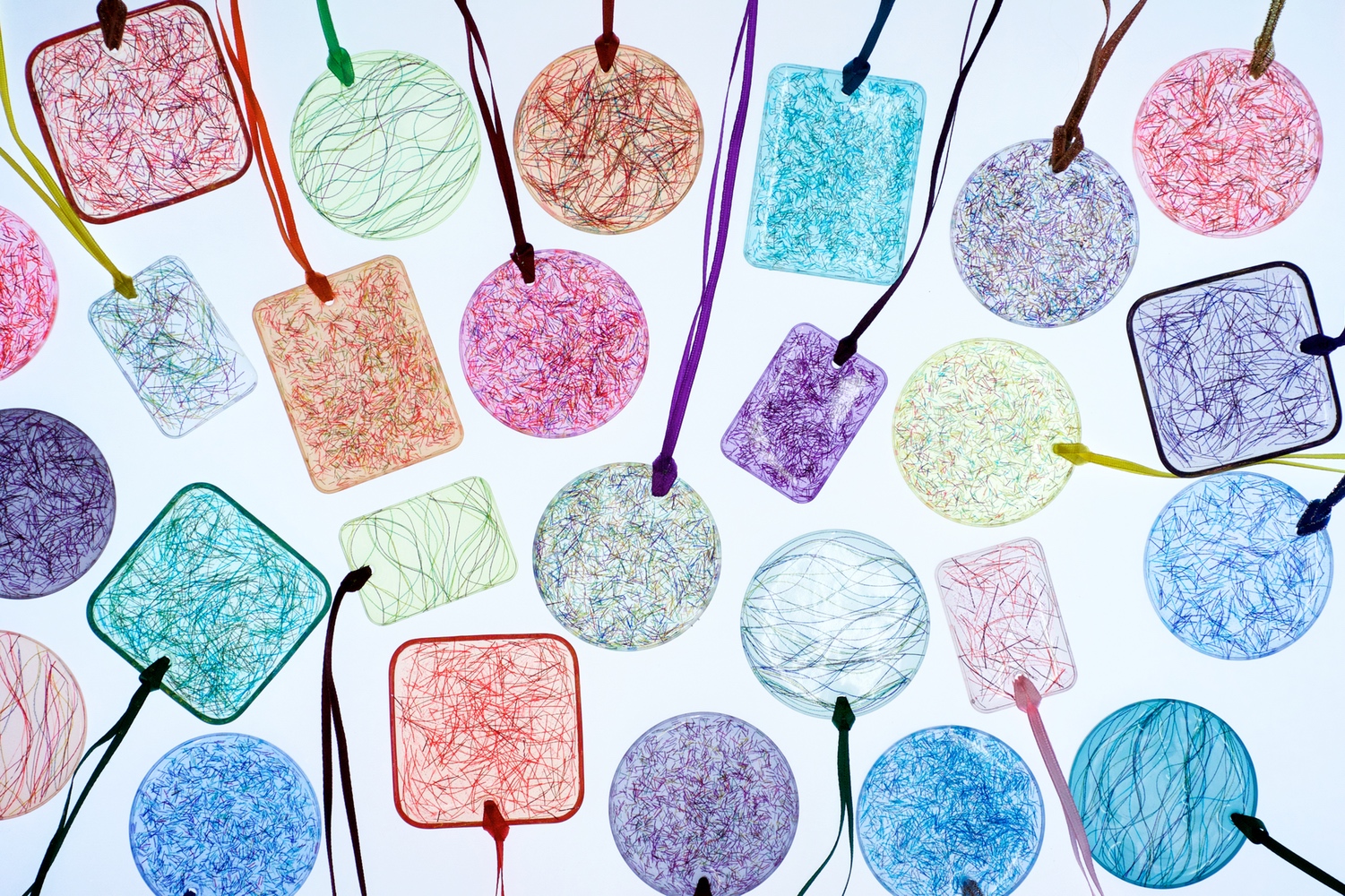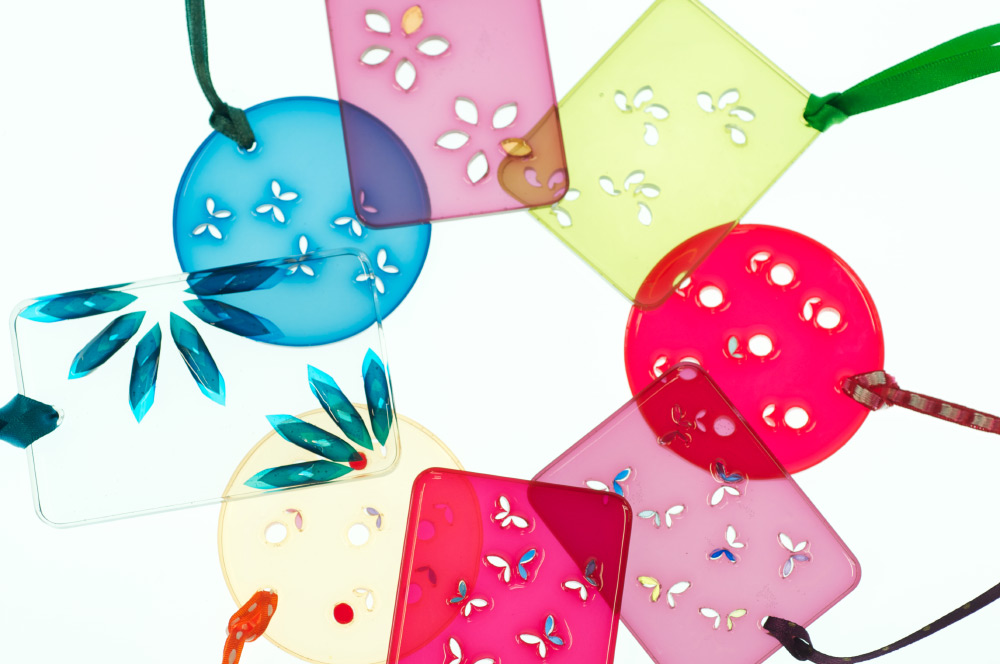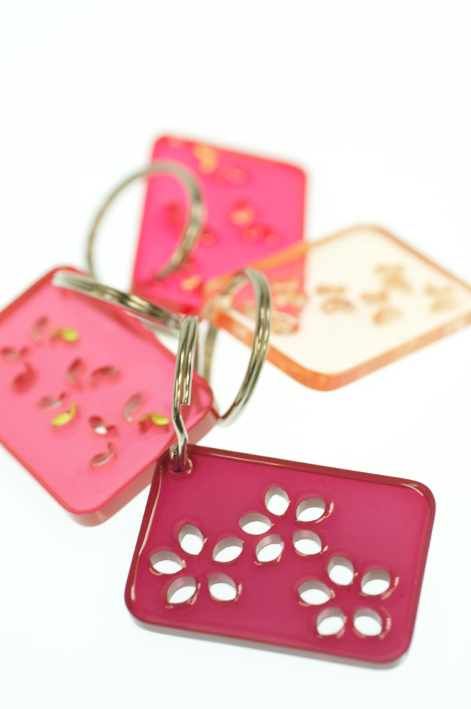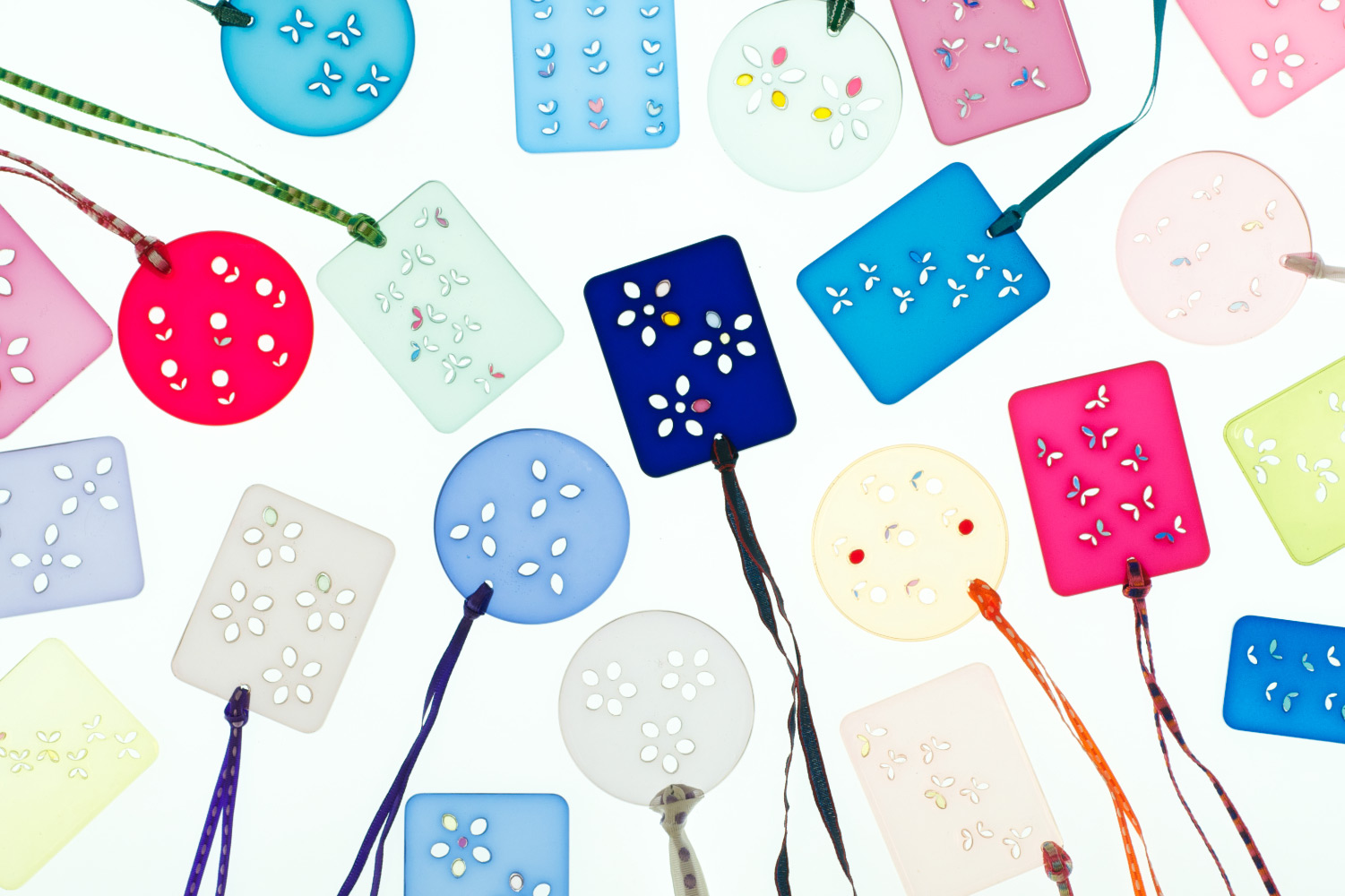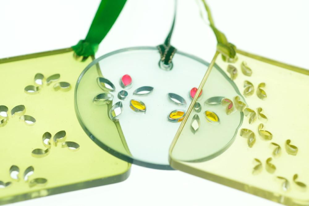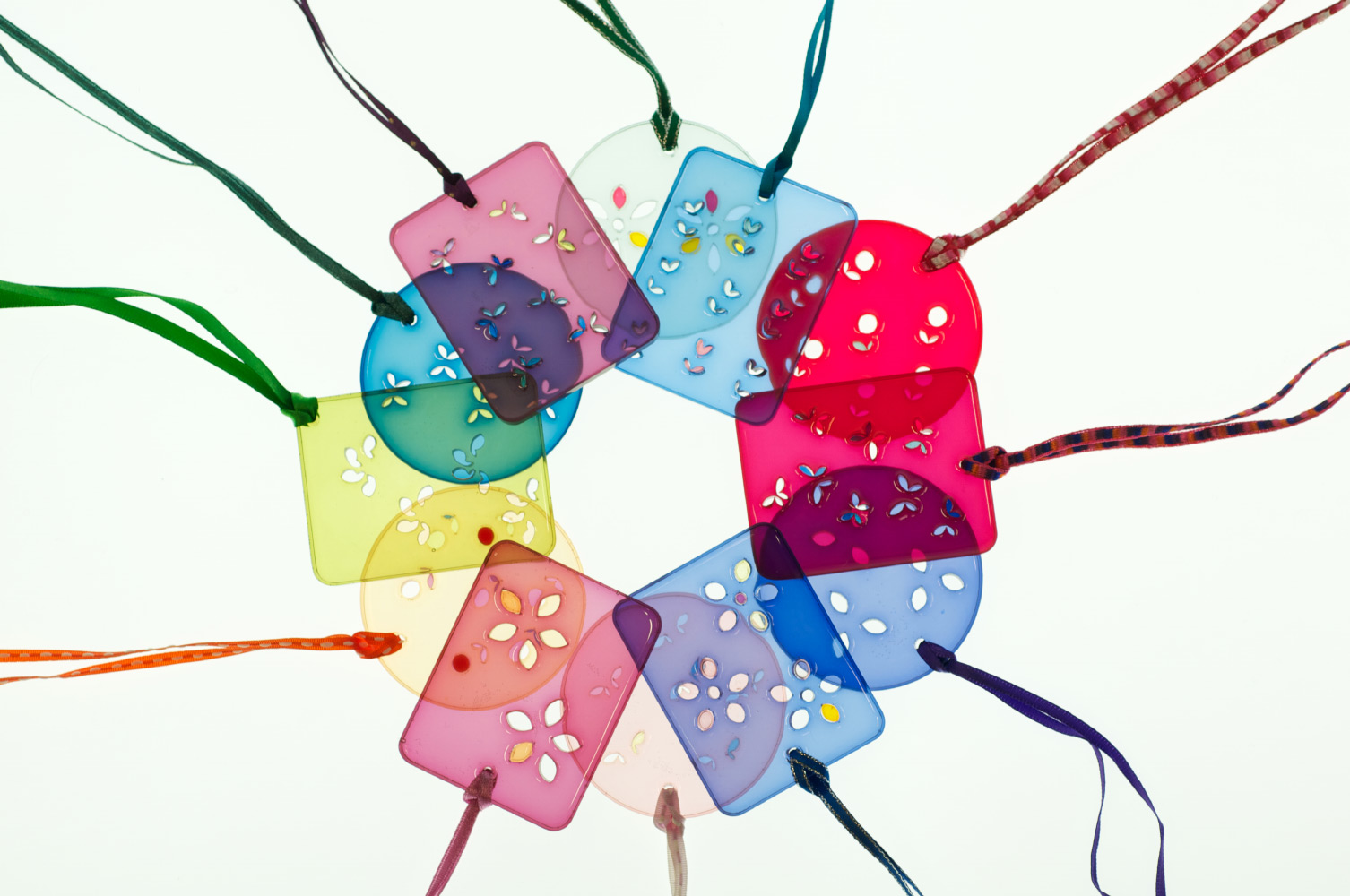 These pieces can be used to create hanging installations, necklaces, brooches and key rings.